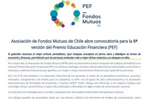 Por octavo año, la Asociación de Fondos Mutuos (AFM) abre la convocatoria para la recepción de trabajos periodísticos en miras al Premio Educación Financiera (PEF), el cual busca distinguir el mejor artículo sobre temas relacionados con el ahorro, inversión y materias financieras que aporten a un mayor o mejor conocimiento financiero por parte de las personas.