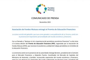 Con un llamado a “destacar el rol e importancia del periodismo económico financiero” se dio inicio a la octava edición del Premio de Educación Financiera (PEF), organizado por la Asociación de Fondos Mutuos (AFM), que reconoce la excelencia y calidad del trabajo periodístico en el ámbito de la educación financiera.